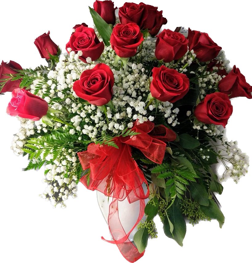 24 long stem RED roses, paired with babies breathe in a glass vase.
